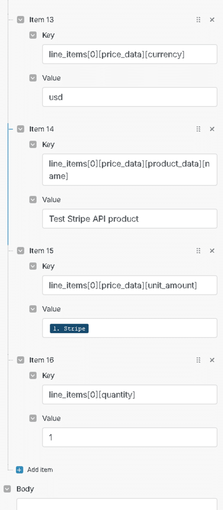- line_items[0][price_data][unit_amount]: Map the product price from SpreadsheetWeb (ensure values are multiplied by 100 for correct Stripe processing).