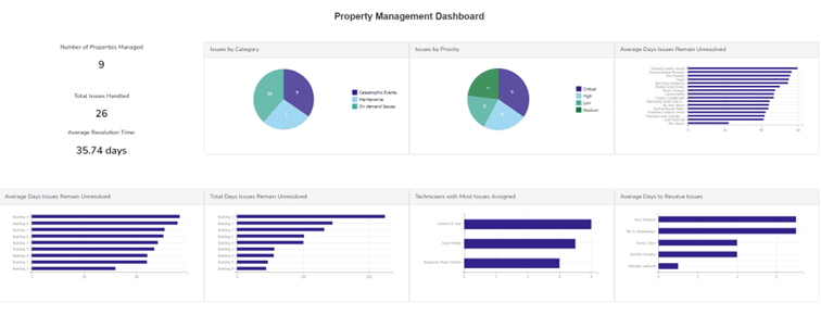 The Property Management Dashboard is instrumental in leveraging data from the "Property Management Application" to deliver timely insights into the management of properties. Working seamlessly together, these applications enhance the management of various property-related tasks. The dashboard, known for its ease of use, draws on the information compiled by the Property Management Application to offer critical insights. This guide aims to detail the dashboard's components and functionalities.