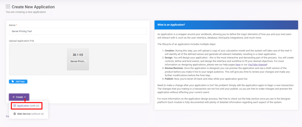 Assuming you already have an account, log in and select Create New Application. Drag and drop your Excel file into the designated area and click Create. When prompted, choose Application (with UI) as the type of application. The other option, API-based application, is tailored for scenarios where an API is required.