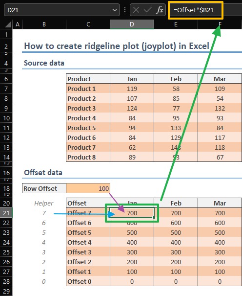 Next, we will generate the offset values. There will be n-1 gaps for n data series. However, to ensure consistency, we also have a row for the 0th gap. The Offset 0 row will get 0 values only. The other data series will have an offset value multiplied by the row. A helper column with the row (gap) numbers will make things easy.