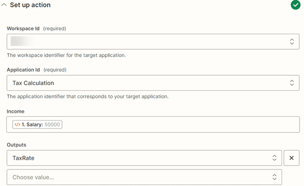 Choose your workspace and application to populate the named ranges in your workbook. For example, we named the cell F4 as "Income" which appears as an input box. Bind the value you want to calculate its tax to "Income" and select the named range of the cell that contains the formula ("TaxRate").