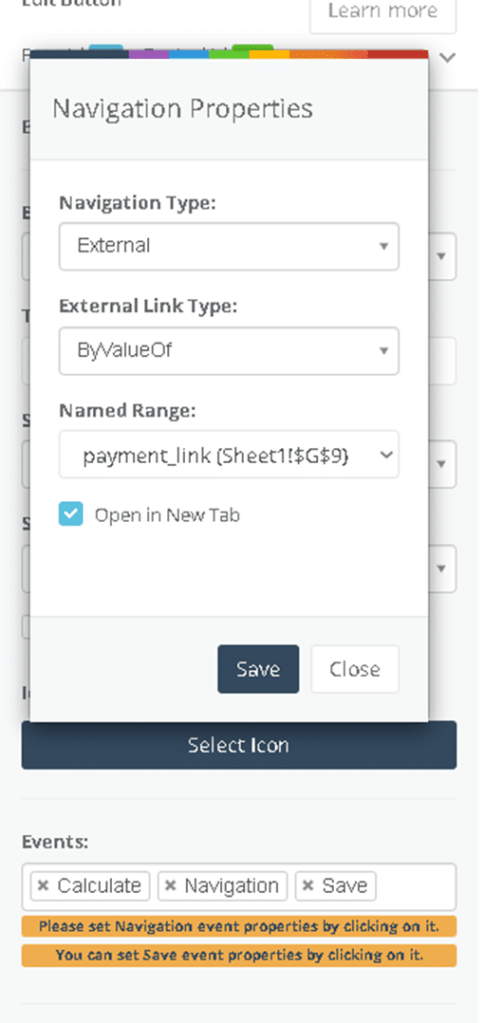 - Select the named range (SelectedPaymentLink) as the URL source.