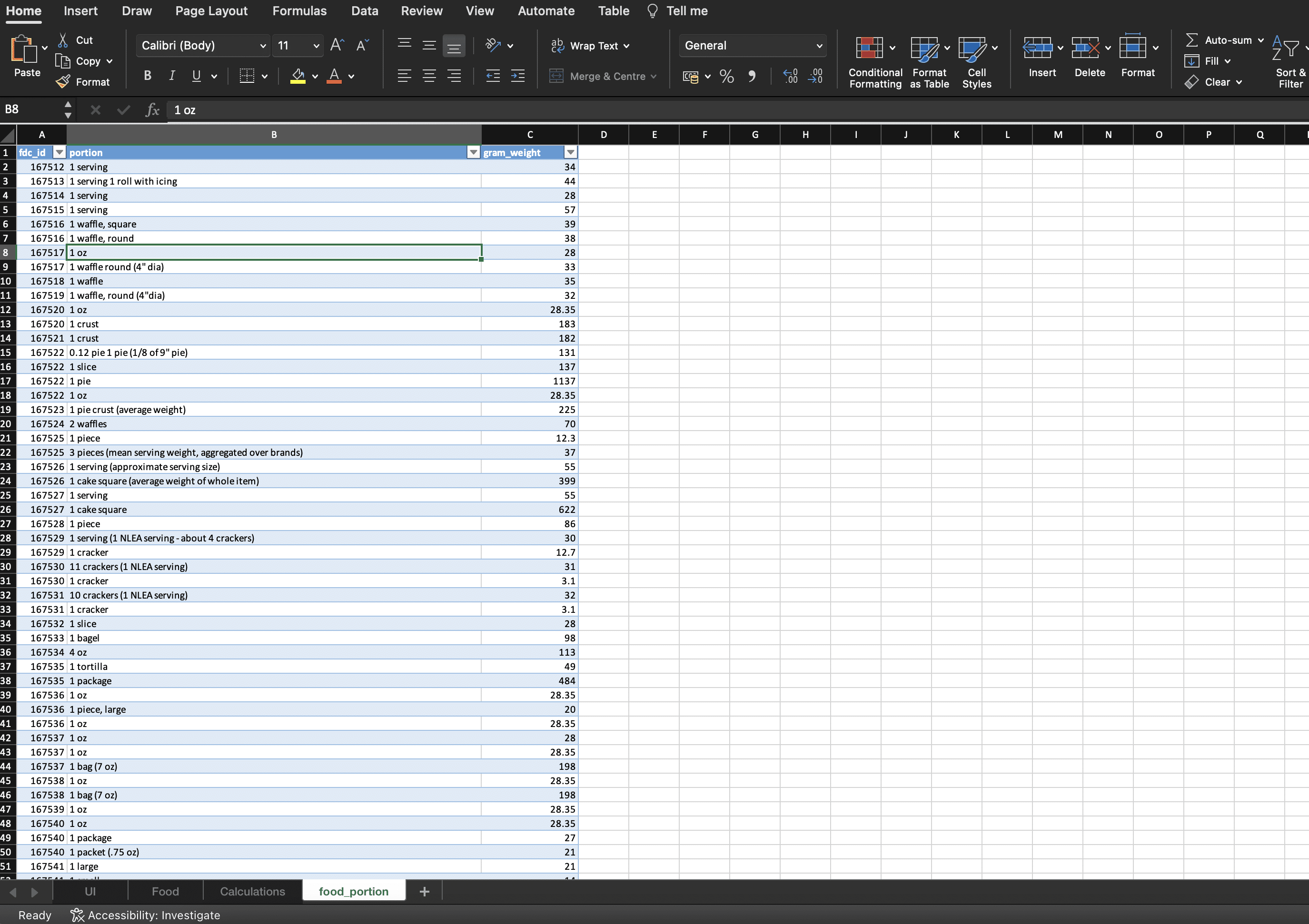Our workbook will contain three central sheets: UI, Food, Calculations, and an additional food_portion sheet. Each plays a crucial role in the functionality of our calculator.