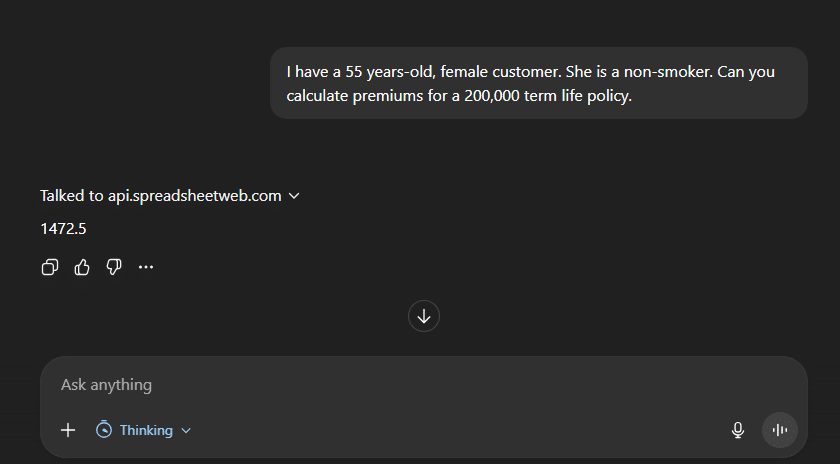 To make this real, consider a sales quoting application built in SpreadsheetWeb. The underlying Excel model includes product rules, pricing tables, customer tiers, regional pricing adjustments, discounts, and approval thresholds. A rep might ask: “Create a life insurance quote for a 35-year-old male for a coverage face amount of $200,000.” That request is easy to say and surprisingly hard to execute consistently without a guided tool—unless AI is connected directly to the quoting application.