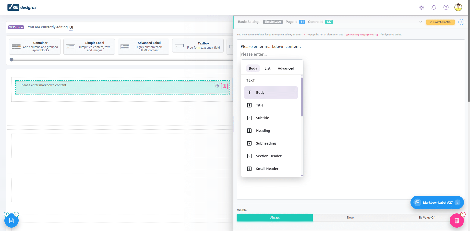 The highlight of this release is the new Simple Label control, a markup-based component designed to simplify how text and content are displayed in your applications. It provides a streamlined way to add structured text such as titles, headings, and descriptive content without the need for complex configuration. In addition to basic formatting, the control supports richer content such as lists, alerts, images, tables, and carousels, allowing you to present information in a more organized and engaging way.