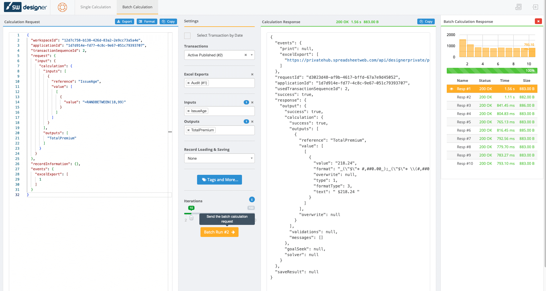 When combined with dynamic formula evaluation, which allows for the randomization of inputs in the API request, this feature becomes especially powerful. By varying the inputs, you can simulate a wide range of scenarios and edge cases, ensuring that your system handles diverse data effectively. This is especially valuable for validating the latest versions of your workbook between releases.
